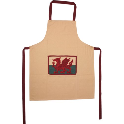 WA101D-BIB APRON-WELSH DRAGON-RUSTIC DARK RED, GREEN AND TEA-27X33INCHES/69X84CMS-Y Ddraig Goch-The Red Dragon-Standard Size, Front Pocket, Long Ties, Patchwork And Appliqued Embroidered-Heavy Duty Duck Cotton Fabric