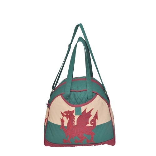 WA101D-OVERNIGHT BAG-WELSH DRAGON-RUSTIC DARK RED, GREEN AND TEA-22X11.5X7.5INCHES/56X29X19CMS-Y Ddraig Goch-The Red Dragon-Patchwork, Appliqued, Embroidered, Padded, Quilted, Four Pockets On Outside, Inside Zip Pockets, Adjustable Shoulder Strap And Airline Cabin Baggage Size-Heavy Duty Cotton Duck Fabric & Polyester Stiffner lining
